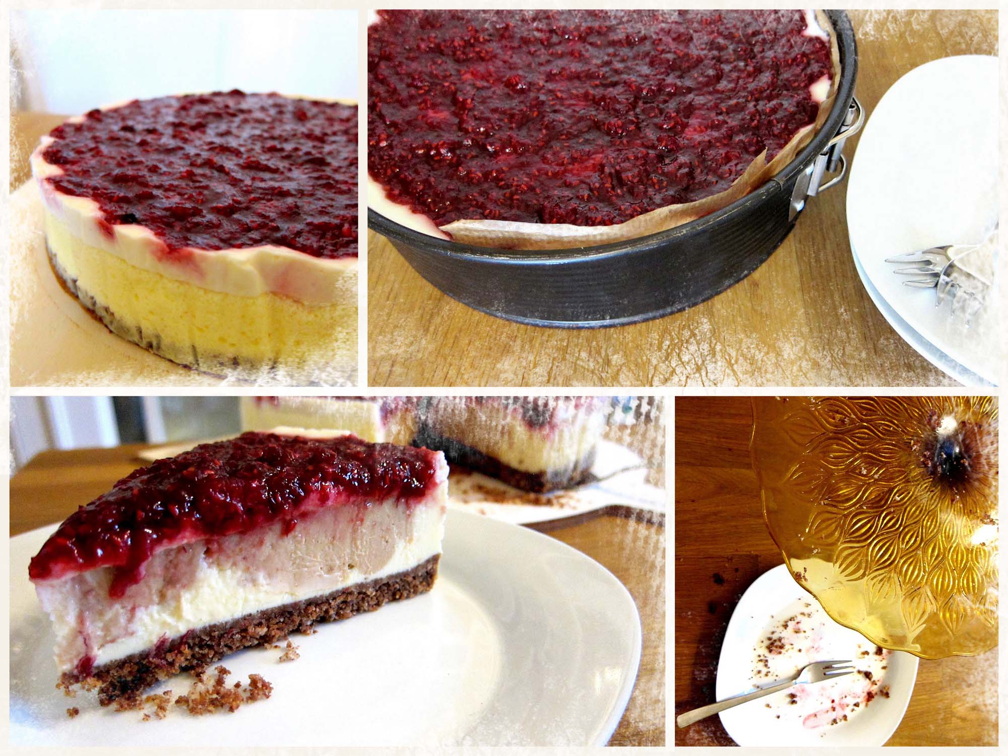 Und hier nun meine heutige Version – geschaffen aus dem, was Vorrats- und Kühlschrank noch hergab (… blöd wenn man einen Blog startet und nur noch 3 Eier, etwas Frischkäse, Kekse und Tiefkühlhimbeeren im Haus hat…)