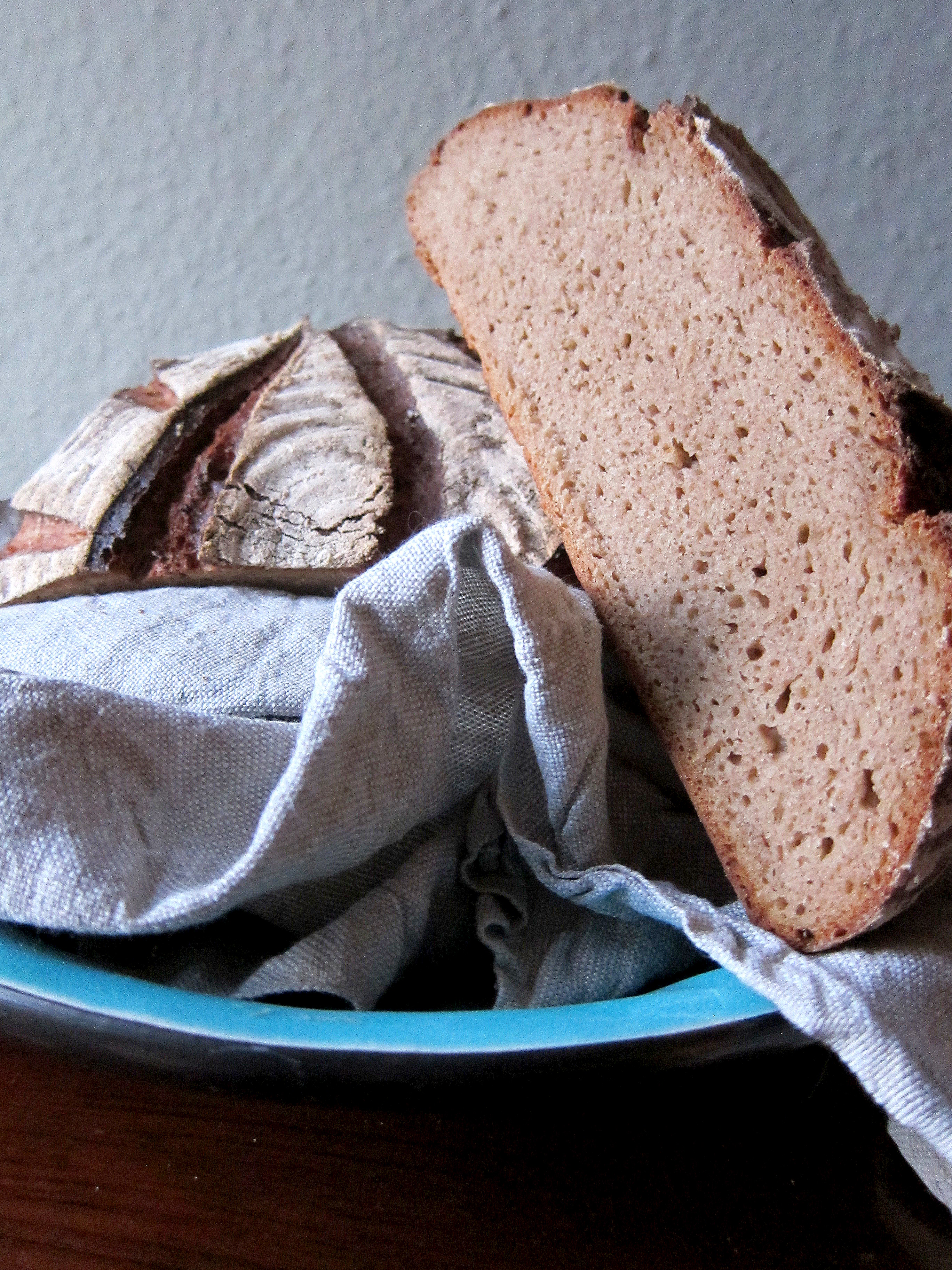 Was mich dazu brachte vor einem dreiviertel Jahr mir einen eigenen Sauerteig zu ziehen, weiß ich gar nicht mehr, aber es war ein Volltreffer. Ja, einige Brote mit Hefe hatte ich davor auch schon gebacken, für „Arbeitsstullen“ und so, war ok, wenigstens selbstgebacken. Aber mit dem erfolgreich selbstgezogenen Sauerteig und der Entdeckung des Plötzblogs ging es dann so richtig los mit dem Brotbacken und mir. Mittlerweile habe ich immer mindestens 10 verschiedene Mehlsorten zu Hause, einen Roggensauerteig und einen Weizensauerteig im Kühlschrank, Bäckerleinen, Gärkörbe, Brotbackstein, Ofenthermometer, Löffelwage, Teigabstecher und eine Monsterküchenmaschine, die den Teig wunderbar knetet. Passende Rezepte? Auch kein Problem: Stundenlang könnte ich in den Blogs von Lutz, Stefanie und Björn stöbern, und dabei ellenlange Listen machen, welches Brot mein nächstes sein wird. Denn ich habe sie wiedergefunden, meine Liebe zu Brot.