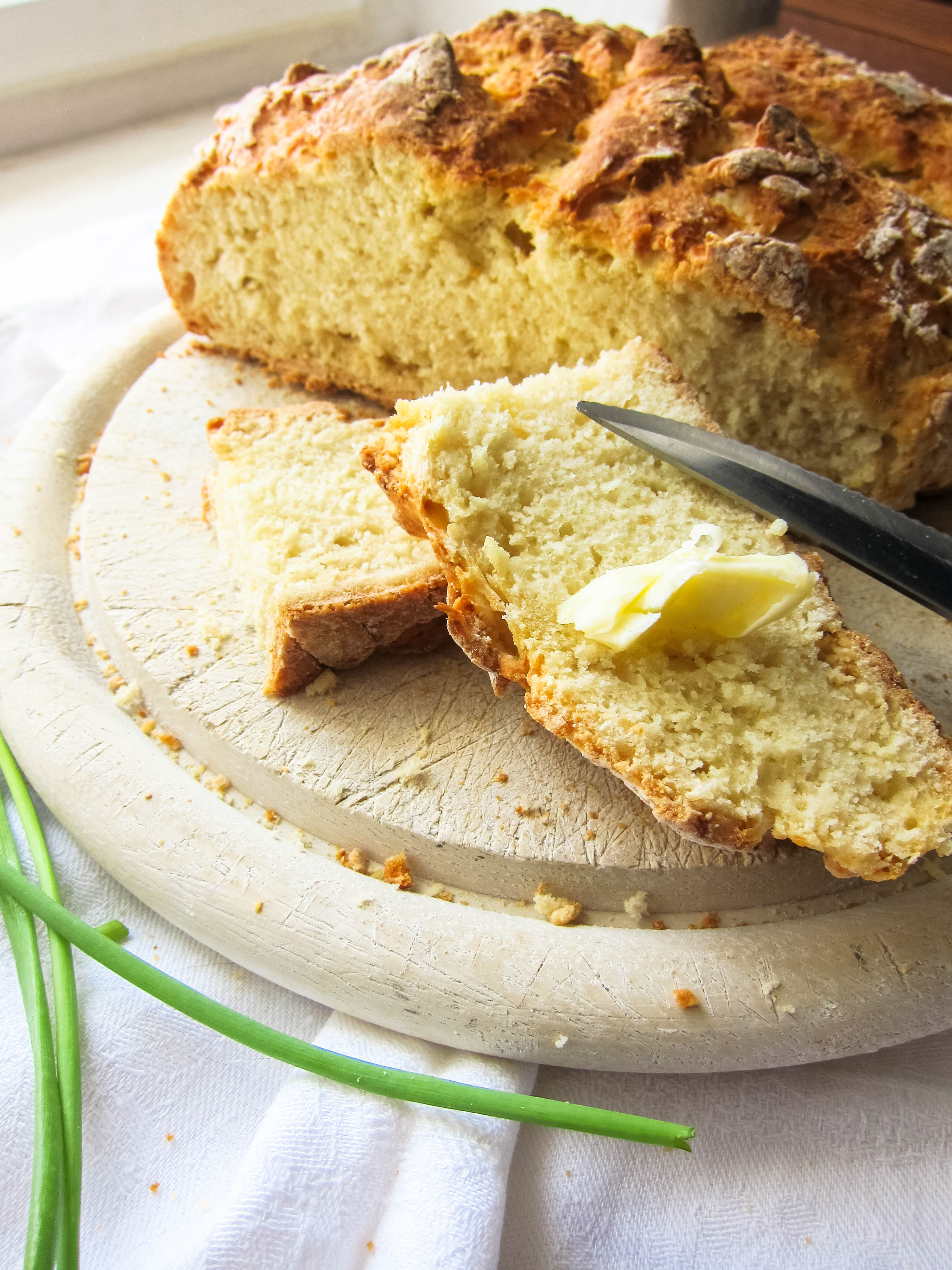 Das Brot verströmt beim Backen einen Duft der mich sofort wieder in diesen Urlaub zurück versetzt: die grünen Wiesen das Meer, die Schafweiden, unzählige freundliche Menschen, die uns unterstützten, wenn wir mal wieder im irischen Dauerregen mit unserem Zelt „abgesoffen“ waren –  eine wundervolle Zeit, ein toller Urlaub – schön dass man sich die Erinnerung daran so leicht nach Hause holen kann. Und es ist wirklich ein sehr unkompliziertes Rezept – kein Kneten (kneten wäre sogar ein ganz grober Fehler), kein Gehen, kein Kühlen – Ratzfatz steht es auf dem Tisch und ist damit ein tolles einfaches Brot. Abwandlungen mit Cheddar und Lauchzwiebeln im Teig, mit Vollkornmehl als Brown Bread, oder mit Rosinen im Teig als „Spotted Dog“ machen es vielseitig. Es ist allerdings ein Brot, welches schnell gegessen werden sollte, nach 1 bis 2 Tagen wird es doch recht trocken.