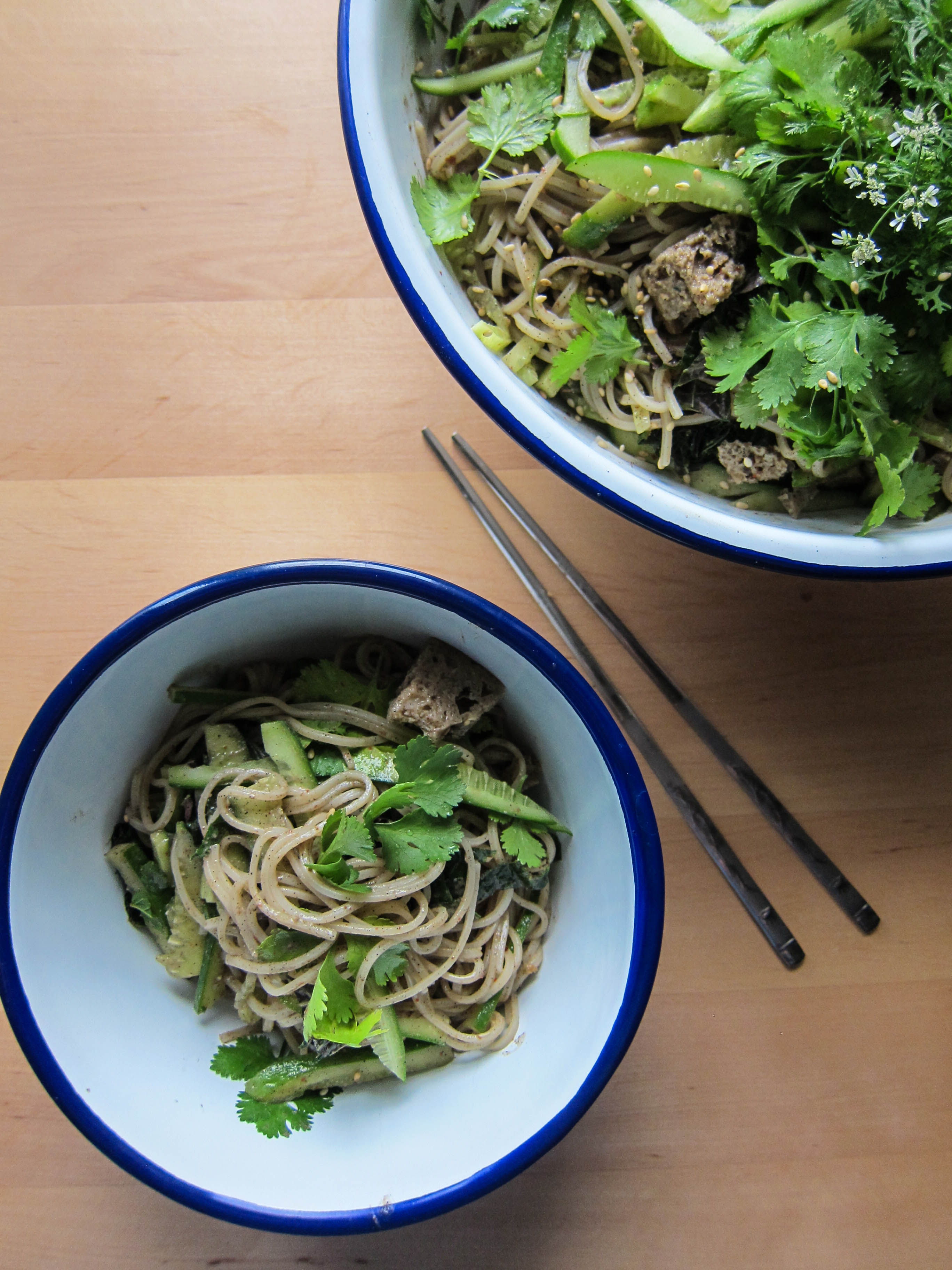 Für dieses Gericht habe ich mich entschieden, da es der großen-kleinen  digitalen Welt auf instagram entspringt. Weltoffenes Teilen und Vernetzen mit Gleichgesinnten aus allen Ecken des Globus ist hier ein leichtes. Es ist wunderbar zu sehen, dass ein Hobby wie das Kochen, der Austausch darüber und  das Lernen vom Anderen spielend leicht Grenzen überwindet. Anja die ich hier traf, aktuell gerade im Umzug von Neu- nach Altengland, aß dieses kalte chinesische Nudelgericht mit Sesam und Gurken oft während ihrer Zeit in Peking. Ihre Liebe für Sauerteigbrot ließ sie den Tofu im Gericht durch Brot ersetzen und sie sagt der Geschmack ist verblüffend authentisch.