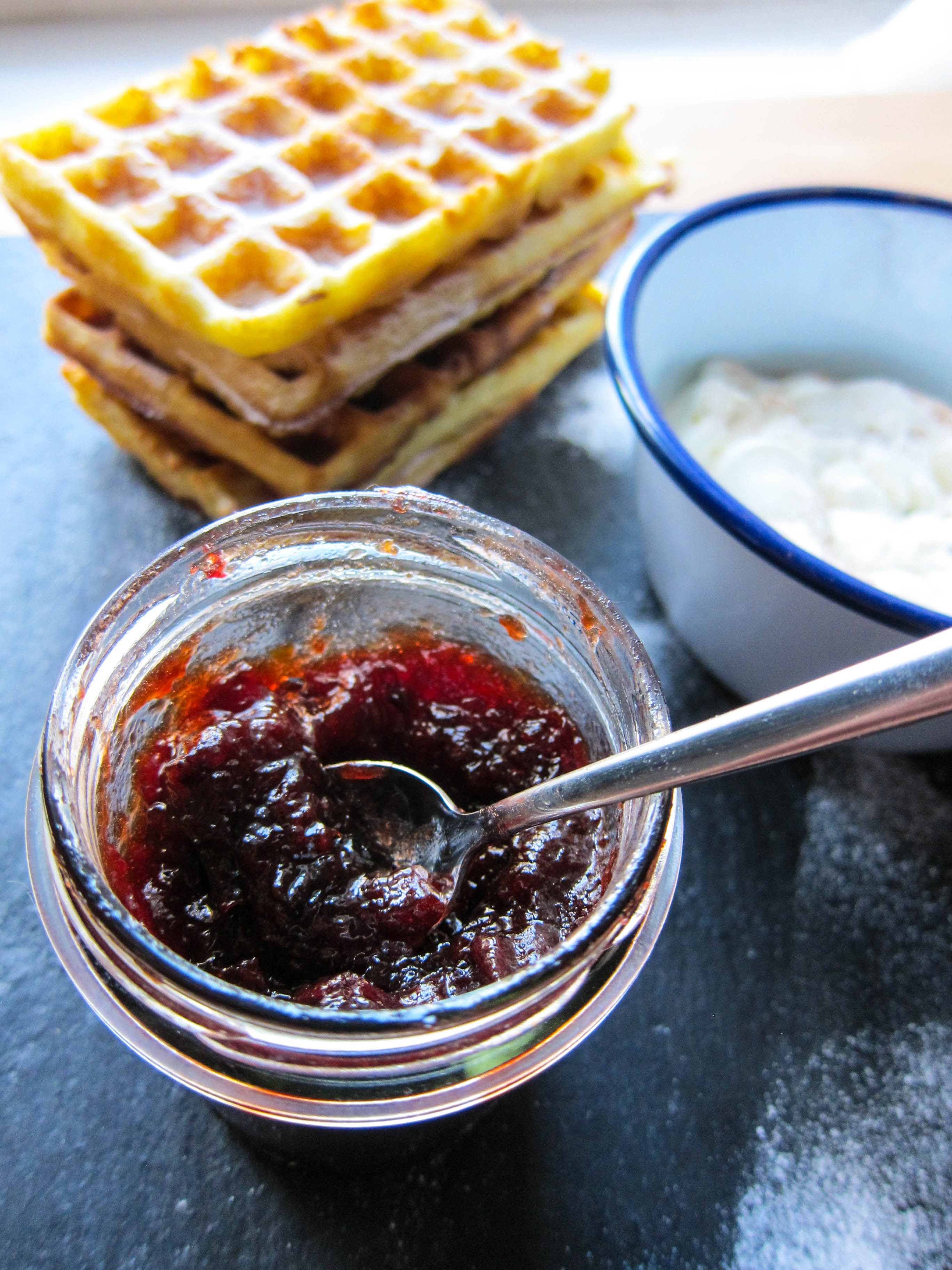 Der Alltag und die Eile hat mich wieder. Zum Willkommen gab es eine 7 Tage Arbeitswoche. Viel zu schnell verblassen so die Erinnerungen an den gerade einmal 2 Wochen zurückliegenden Urlaub. Schöne Erinnerungen vom Wandern durch Schluchten, vom kühlen Gefühl der Füße im Meer und an die Gassen neu entdeckter Städte. Aber Platz muss her im Kopf, Arbeitsspeicher wird benötigt, zum funktionieren. Und so können sich nur die besonders schönen Dinge halten. Nur das, was mit allen Sinnen erlebt und gefühlt wurde und sich im Laufe der Jahre festigen konnte durch stetiges Erinnern. Es ist für mich nicht verwunderlich, dass Kindheitserinnerungen oft so bunt sind, als wäre es erst gestern gewesen, während man andererseits nicht mehr weiß, was man eigentlich heute vor einer Woche gemacht hat. Vielleicht wisst auch Ihr noch ganz genau, was eure Oma immer besonders gern gekocht hatte. Wenn ihr daran denkt, seht Ihr Euch vielleicht selbst, wie Ihr damals in der Küche saßt und beim Kirschen entkernen für die Marmelade geholfen habt. Habt den Geruch noch in der Nase, der damals durch die Küche strömte, wenn der frisch gebackene Kuchen aus dem Ofen geholt wurde oder habt den unvergleichlich cremigen Geschmack von Omas Grießpudding auf der Zunge, den nie wieder ein anderer Grießpudding erreichen sollte. Auch Spitzenköche haben Omas. So wie Paul Bocuse, dessen Oma in ihrer Küche für den kleinen Paul Waffeln backte. Buttrige, knusprige und doch luftig leichte Waffeln. Ganz anders als das studieren der Zutatenliste andeutet. Sie müssen ihm sehr geschmeckt haben, die Waffeln seiner Grande-mère, so wurde dieses Rezept doch in einigen seiner späteren Kochbücher veröffentlicht. Der große Paul Bocuse war mir natürlich ein Begriff, seine Rezepte jedoch bisher nicht. Anregung gab mir wieder Petra von der Mut anderer mit ihrer Reihe Kochen aus historischen Kochbüchern. Und wieder wurde ich wirklich köstlich inspiriert. Ganz passend fand ich dazu ein weiteres Großmutterrezept – selbstgemachtes Pflaumenmus aus dem Backofen. So wunderbar aromatisch und verblüffend einfach. Ab jetzt nur noch selbstgemacht!
