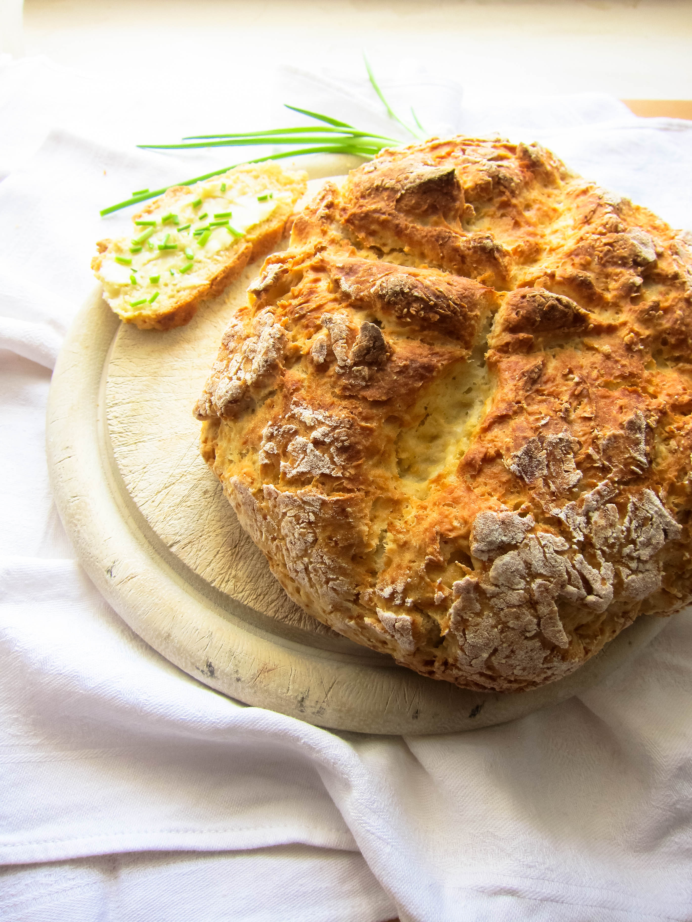 Als Gastgeberin backe ich natürlich auch etwas. Und nicht irgendwas – ich backe Sodabread. Und ich muss gestehen, die Geschichte mit mir und dem Sodabread begann doch eher als Zwangsliebe. 6 Wochen (!!! – hach, so ein Studentenleben war schon schön) Irlandurlaub mit bester Freundin – low Budget: Zelten, Hiken, Trampen – Essen in Eigenversorgung. Um das obligatorische Grundnahrungsmittel Brot kamen wir also nicht herum. Das erste Sodabread war ein kleiner Schock – optisch von außen ein schöner knuspriger Brotlaib – war der Geschmack zugegeben doch ungewöhlich. Natron und Backpulver sind nicht nur maßgeblich für den Trieb des Brotes verantwortlich – nein, sie sind auch der dominierende Geschmacksgeber (deswegen ja auch Sodabread). Ich glaube eine Woche versuchten wir es mit Toastbrot, einmal kauften wir auch ein ryebread – ungeniesbar, denn darin fehlte jegliches Salz. Wir gaben dem Sodabread also eine zweite Chance – und gewöhnten uns dann doch sehr schnell daran – zusammen mit guter Irischer Butter oder goldgelbem Cheddar ein wahrer Genuss. Es kam wie es kommen musste. Am Ende des Urlaubs landeten unter den Mitbringseln für Zuhause natürlich das obligatorische Kochbuch, welches ein verständliches Rezept für Sodabread enthielt und ein Beutel Natron (sicher, ist sicher ;-))