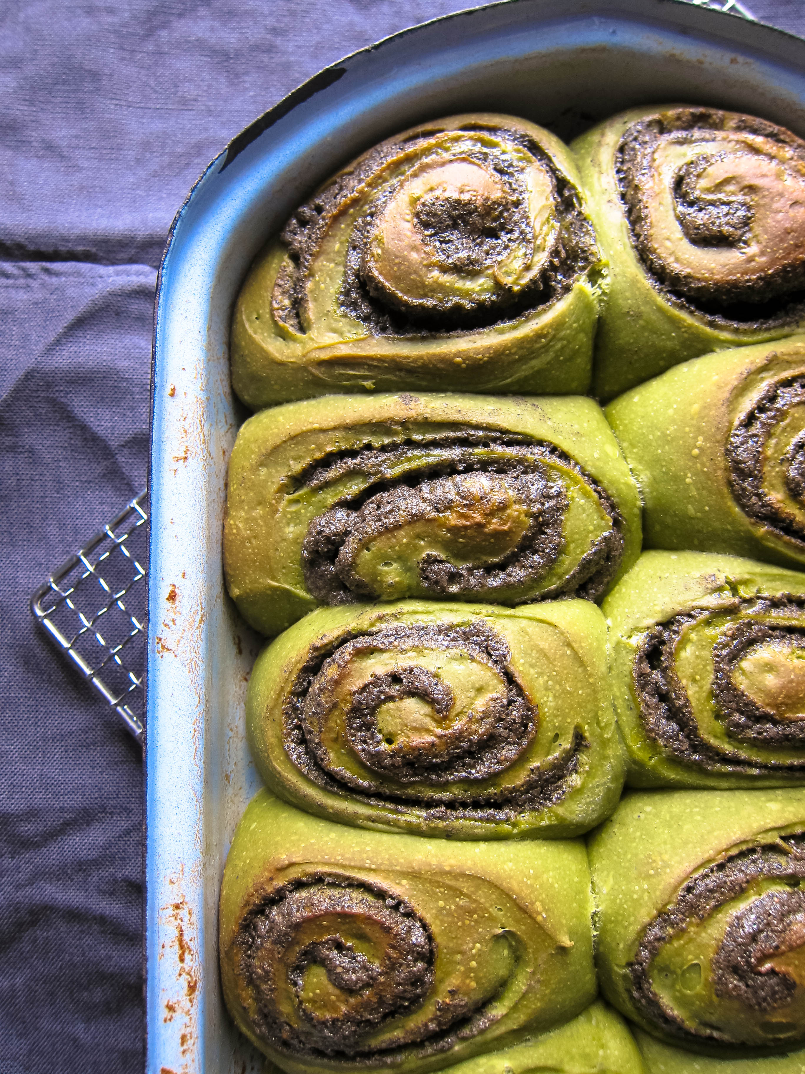 Matcha-Hefeschnecken mit schwarzem Sesam und Zimt
