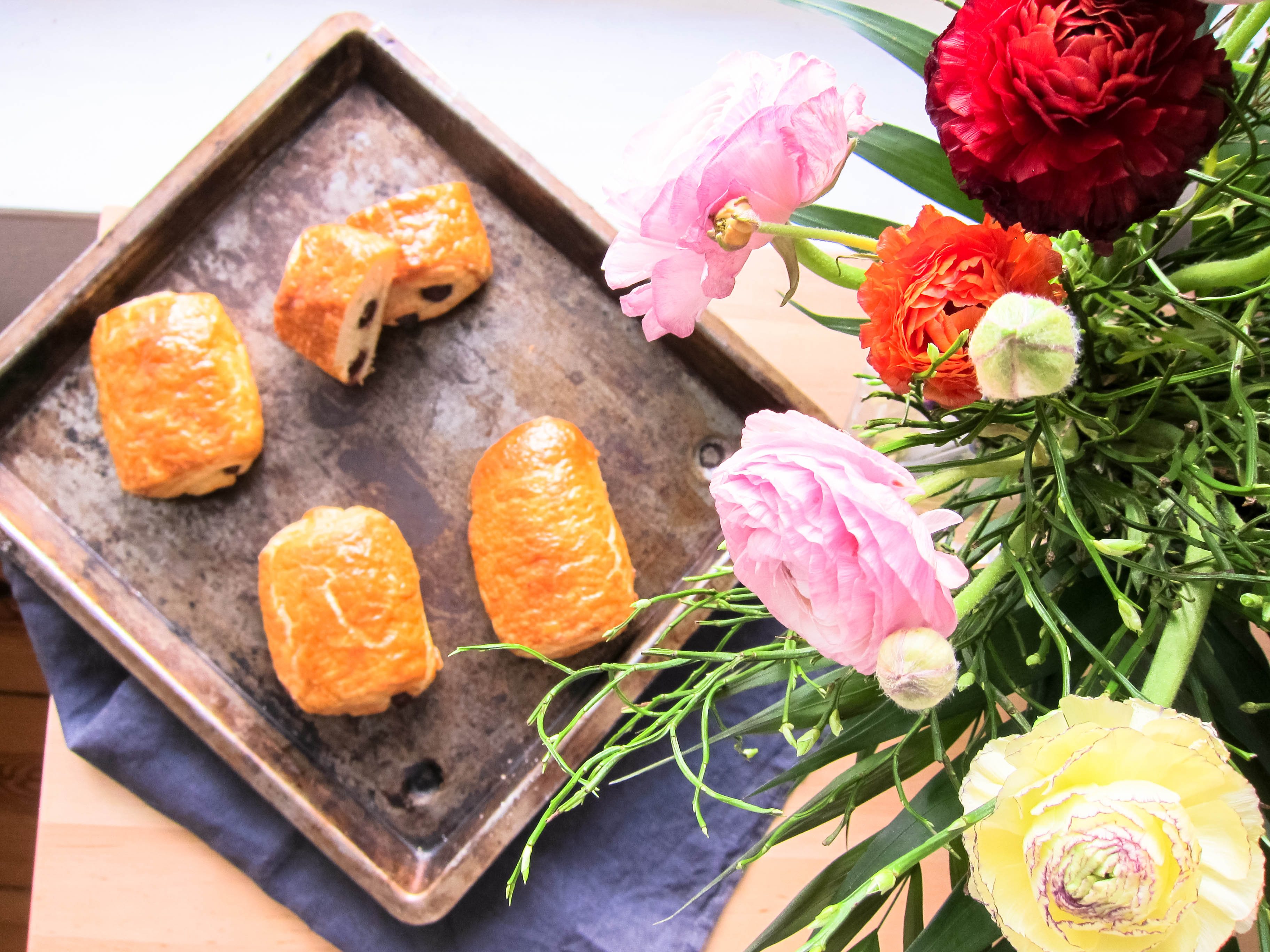 Heute schwelge ich mal so richtig in Erinnerungen zu einem ganz besonderen Anlass – eine meiner besten Freundinnen hat Geburtstag! Ja Ina, dieser Beitrag ist nur für Dich und was könnte ich dir hier anderes backen als Pain au chocolat! Pain au chocolat genau nach dem Rezept, wie wir sie auch damals gebacken haben – in den Freistunden, oder an den von uns zu Freistunden gemachten Morgen (meine Französischlehrerin hätte bestimmt auch Verständniss dafür gehabt, dass ich lieber Pain au chocolat backe, statt im Unterricht Verben zu konjugieren ;-)). Damals, als wir mit dem Begriffen Butterstück, Tourieren und Poolish überhaupt zum ersten mal in Berührung kamen. Was hab ich geflucht, wenn ich mühselig versucht habe, die (so ist es ja immer in den Rezepten beschrieben) eiskalte, steinharte Butter in den Teig einzuarbeiten. Egal! Immer und immer wieder wurden diese kleinen Teilchen gebacken, dazu Freundeskreis gehört und Erdbeer-Rhabarber-Sahne-Tee getrunken….was für eine schöne Zeit, kaum zu glauben, dass das alles schon 15 Jahre her ist. Um so schöner, dass es „uns“ immer noch gibt. Ich bin ja im umgangssprachlichen eher ne „schlechte“ Freundin – melde mich viel zu selten, Telefonieren ist auch nicht so mein Ding, und meine Arbeit im Schichtdienst beansprucht Planung für die viel zu seltenen Besuche bei Freunden und Familie. Aber ich habe Glück, und es gibt doch Menschen, die das nicht persönlich nehmen. Wie die liebe Ina. Also, Ina, alles alles Liebe zum Geburtstag! Und natürlich nochmal tausend Dank, für deine Hilfe dieses „Baby“ namens BLOG auf die Welt zu bringen! Ich hoffe, das Rezept bereitet Dir Freude! Unsere Pains von damals sind nach heutigen Maßstäben sicher nicht perfekt, da hätte ich schon ein paar Verbesserungsideen – die Tourierbuttermenge muss zum Beispiel angepasst werden, um einen grobblasigere Krume zu bekommen, aber es sind nun mal die Pain au chocolat aus der „guten Alten Zeit“! Also sollen sie auch ganz genau so sein und sind nun hiermit auf diesem Blog verewigt. Happy Birthday!